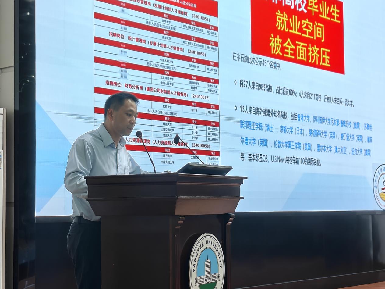 王雅诗以“‘职’引未来‘就’在荆州”为题,为与会同学开展了就业指导,她着重介绍了当前就业形式和心理、企业具体情况、招聘面试技巧及荆州的就业创业政策,帮助同学们更好地理解目前企业的运作模式、团队合作精神和创新理念,激发了他们对未来工作的期待和热情。