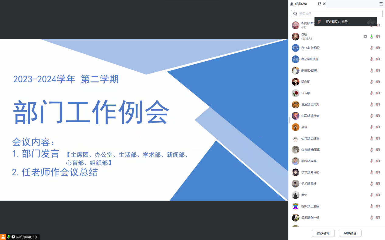 (通讯员 张悦)为进一步增强研究生会学生干部的奉献精神和服务意识,保障新学期有序、高效、保质开展研究生会各项工作,2024年2月29日下午15:00,yl9193永利集团研究生会在线上召开了本学期的第一次工作例会。全体研会干部参会,研究生辅导员、研究生会指导老师任玉婷出席本次会议。