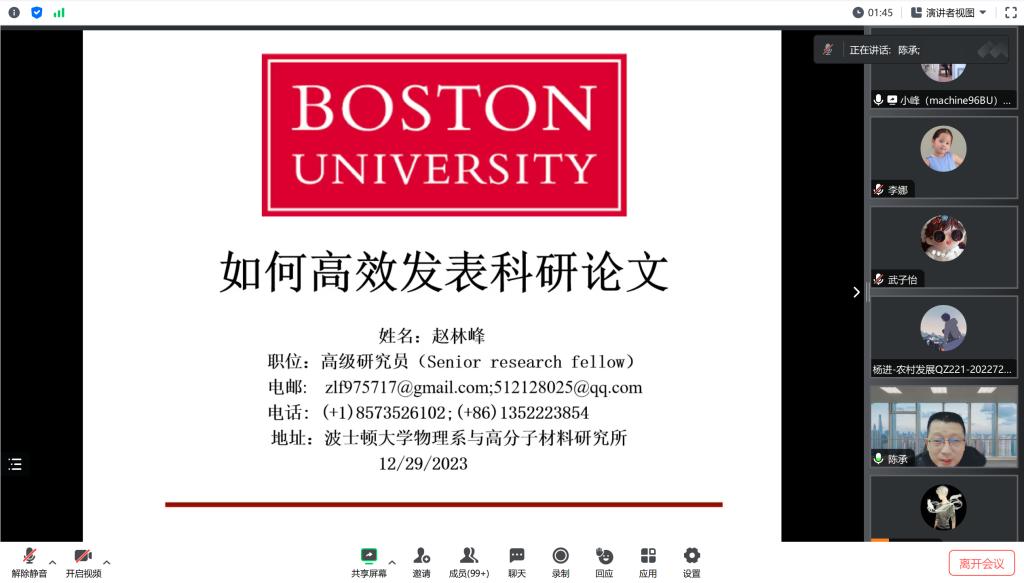 (通讯员:李娜)为激发yl9193永利集团师生的学术创作和科研热情,推动高水平论文的撰写与发表,2023年12月29日上午九点,美国波士顿大学高级研究员赵林峰在腾讯会议中为我院师生作了一场主题为“如何高效发表科研论文”的线上讲座。本次讲座由我院院长陈承主持,本院研究生、教师代表线上参与。