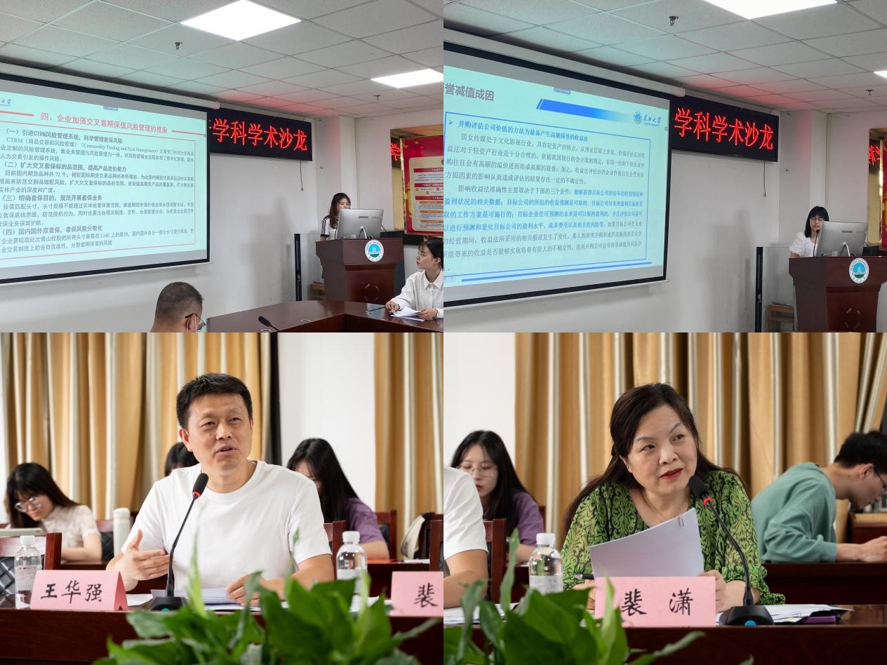 活动开始,在主持人的介绍下,经济组的李文静、彭书范和李玉霖同学依次进行汇报,姚志老师对三位研究生的分享做出点评并进行总结,肯定了三位研究生的研究内容,对文章中存在的不足提出了修改建议,鼓励同学们多关注优秀文章,努力撰写出高水平论文。随后管理组的王雅、程静和田柏翠同学进行学术分享,裴潇副院长和王华强教授分别做了点评,针对各自选题意义做出评价,肯定了研究价值,对主讲人的分享表示肯定并提出相应建议。