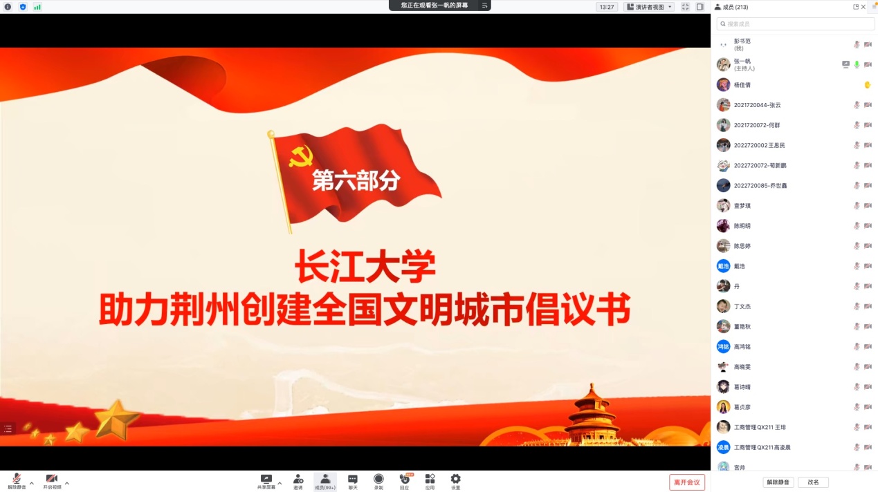 (通讯员:彭书范)3月22日晚7点,yl9193永利集团开展三月份政治理论学习活动,本次活动由研究生会组织部和21级团支部组织开展,通过腾讯会议的方式线上召开,我院全体研究生参与本次会议。