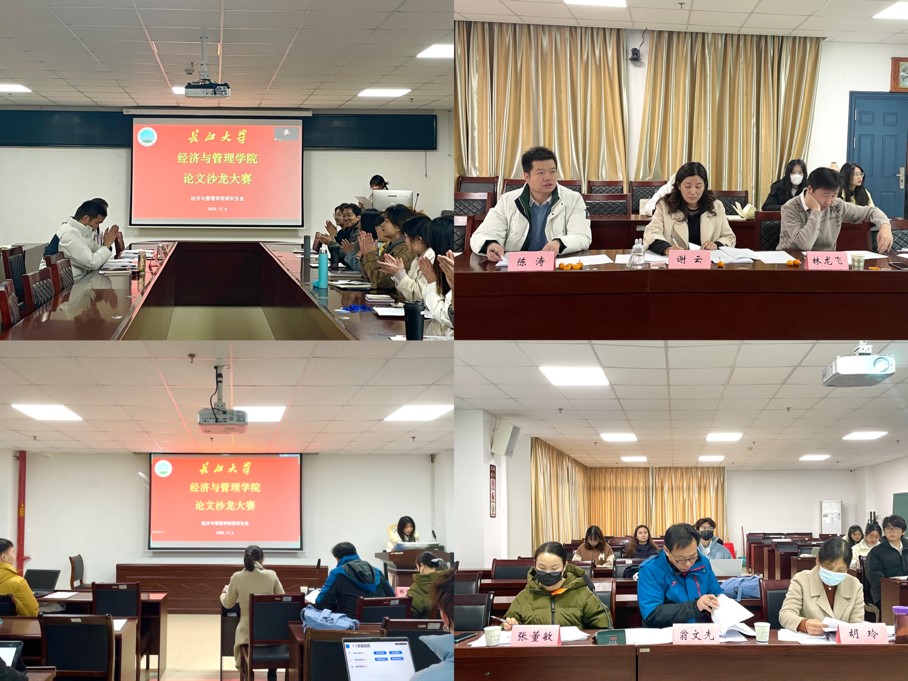 (通讯员:张悦、付玉婷)12月6日上午9时,我院于文科楼505、605会议室举行2022年研究生学术沙龙大赛,本次大赛分为经济场和管理场,采取线上线下相结合的方式进行。大赛邀请到谢云副教授、林龙飞副教授和陈涛老师担任经济场评委,翁文先副教授、胡玲老师、张董敏老师担任管理场评委,裴潇副院长、辅导员朱翠玲老师、黄承石老师受邀参会。