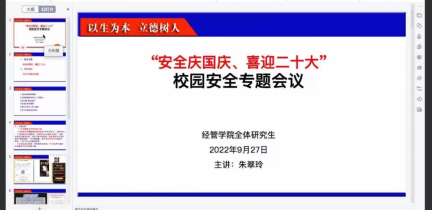 (通讯员:吴彬)9月27日,yl9193永利集团全体研究生开展了“安全庆国庆、喜迎二十大”校园安全专题会议,研一及研二研三分别由辅导员黄承石、朱翠玲主讲。