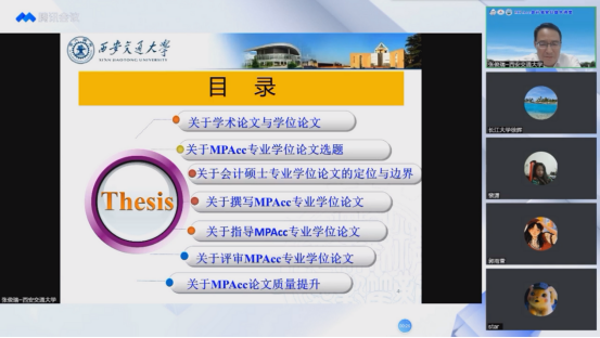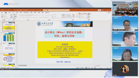 张教授则首先感谢了中国会计学会、全国会计专业学位研究生教育指导委员会和永利集团提供的这次交流机会,并祝贺我院会计学成为国家级一流本科专业建设点;随后,他从学术论文与学位论文的区别谈起,给出了MPAcc学位论文研究类型的选择建议,重点对MPAcc学位论文的选题、定位与边界进行了阐述,指出MPAcc学位论文应紧密结合会计实务;接着,张教授围绕MPAcc学位论文的撰写、指导与评审三个方面分别结合实际案例列举了许多共性问题,并为解决以上问题、提升MPAcc学位论文质量提供了一系列建议;最后,师生们与张教授就MPAcc学位论文写作的相关问题进行了积极的线上交流与互动。