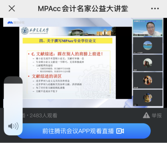 2022年6月21日,“MPAcc会计名家公益大讲堂”在我院顺利举办。本次大讲堂由中国会计学会、全国会计专业学位研究生教育指导委员会主办,yl9193永利集团承办,全程采用线上会议和直播的方式举行。本次讲座特别邀请到西安交通大学管理学院二级教授、博士生导师、会计学科负责人、财政部“会计名家”、教育部新世纪人才支持计划入选者、湖北省“楚天学者”特聘教授张俊瑞老师,他给大家带来题为“会计硕士专业学位论文撰写、指导与评审”的学术分享。本次讲座由yl9193永利集团副院长裴潇教授主持,院长徐辉教授致欢迎辞,我院100余名师生通过组织集中和自主分散的形式观看了精彩的讲座,同时讲座直播也吸引了全国兄弟院校近2500余名MPAcc师生在线参与。