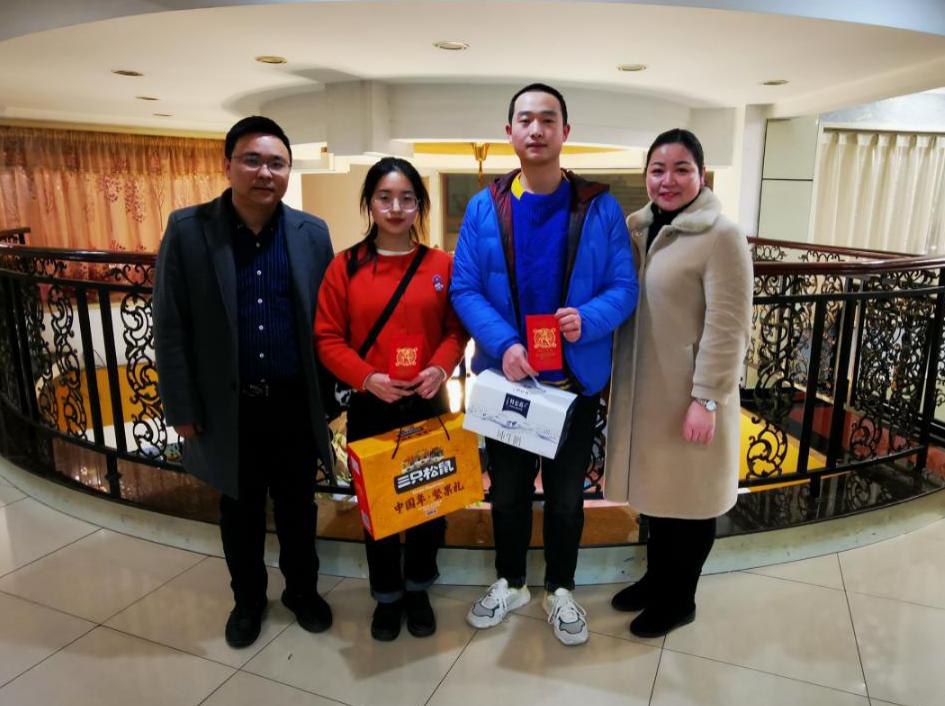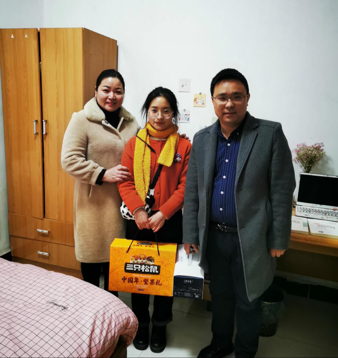 在新春佳节即将来临之际,2021年2月10日下午,经管学院党委副书记王中梅、学工办主任陈思杭和辅导员娄君庭一同走访东校区汉科、新风公寓区域,慰问我院财务11802班王泽霜和物流11702班韩连贵的二名留校学生,陪同学生一起团年并送上美好的新春祝福。
