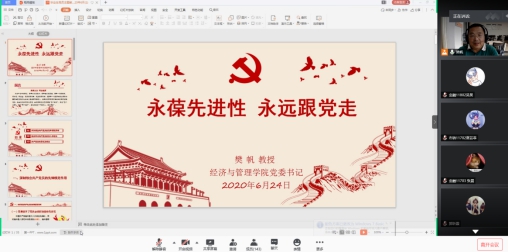 为了积极响应和落实学校组织部关于在全校开展“党课开讲啦”活动,进一步巩固拓展“不忘初心、牢记使命”主题教育成果。6月24日下午三点,yl9193永利集团党委书记樊帆教授给全体学生党员讲授了以“永葆先进性,永远跟党走”为主题的线上党课。