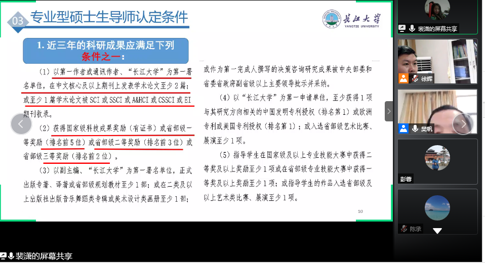 裴潇副院长就研究生日常教学、人才培养、毕业生论文评审、2018级研究生在线开题报告答辩、2020年研究生远程招生复试、制定《学院硕士研究生学位申请的科研(实践)成果规定》六个方面进行了研究生工作的汇报。通报了近期研究生远程招生工作的进展情况,并重点解读了《永利集团教师招收研究生资格认定办法(试行)》 、《永利集团硕士学位授予工作实施细则》两份校发文件。