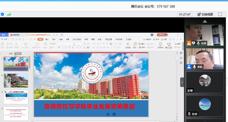 陈承副院长详细通报了本科教学工作,主要包括在线教学、本学期课程考试、教材征订、2020年本科人才培养方案修订、毕业论文答辩、制定本科教学工作管理制度六个方面。他希望老师们根据现今形势,创新教学方法,提升教学质量。