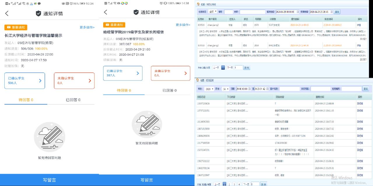 二是建立健全家校联动平台。各年级在以往家校联系平台的基础上,进一步健全和完善家校联系平台,目前各年级均建立了家校QQ、微信等联系平台。同时,学院开通了电信家校协作平台,具备了发送短信、电话通讯等功能。此次,学院利用家校QQ、微信等平台发布了“五一”安全教育提示,通过家长会开展了工作交流并收集了家长的意见,学院通过协作平台给每一位家长发送了心理及安全提示。