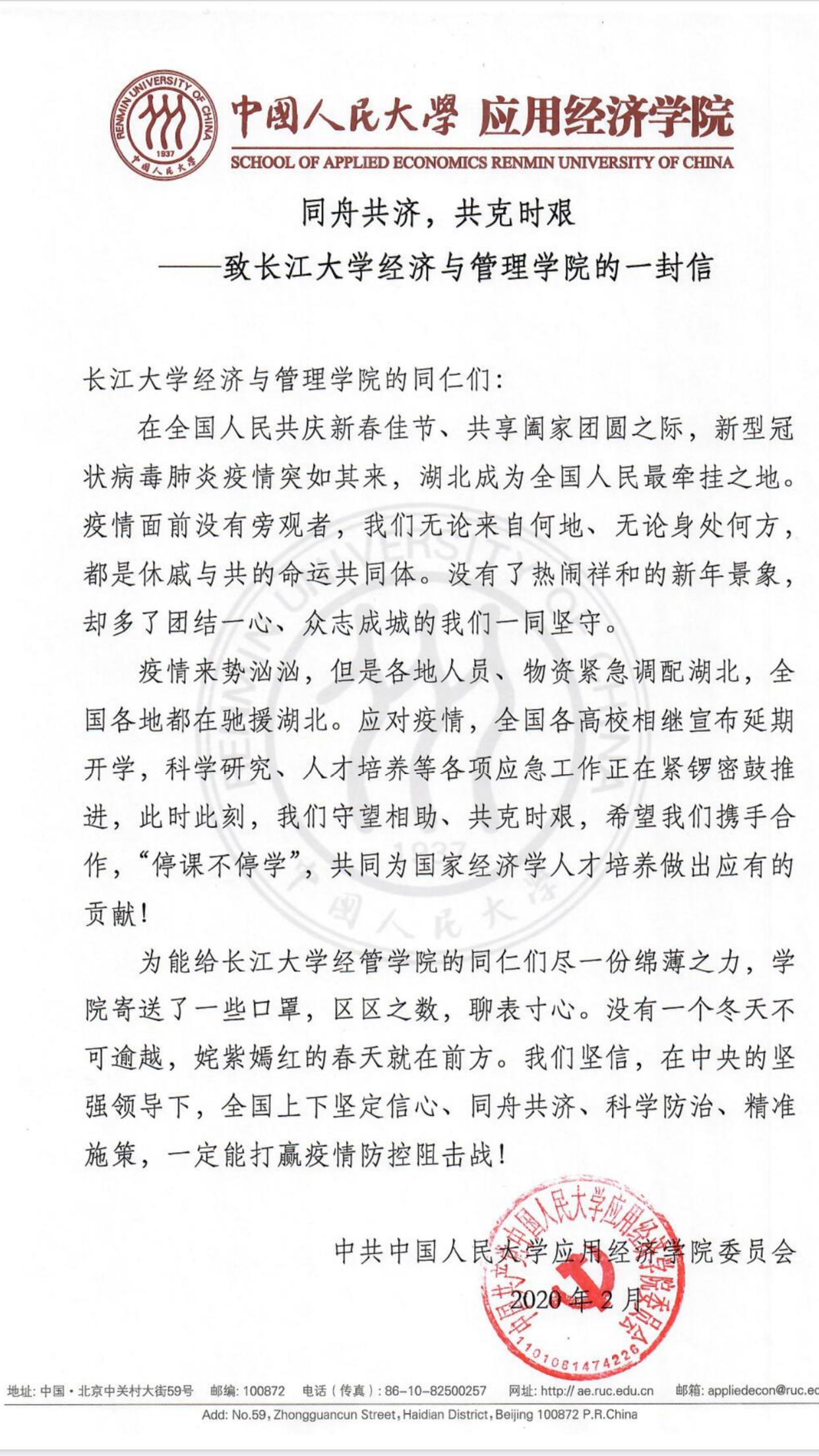 目前,我们全院师生一方面在紧锣密鼓抗击疫情,另一方面正积极响应教育部“停课不停学”号召,科学有序地组织开展线上教学、科学研究等工作。在这个特殊时期,中国人民大学应用经济学院主动伸手驰援我们,我们铭记在心。疫情无情,人间有爱,就让我们一起守望相助,共克时艰,同时也希望我院教职工以此为契机,多向中国人民大学应用经济学院学习,采取“大手牵小手”的方式,在人才培养、学科建设等方面有更大的收获。