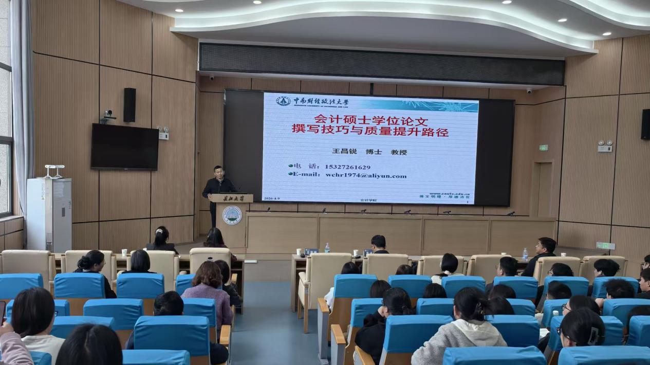 讲坛上半场,中南财经政法大学会计学院王昌锐教授以《会计硕士学位论文撰写技巧与质量提升路径》为题,为师生带来系统的学术写作指导。讲座伊始,王昌锐教授阐释了学位论文质量的核心价值,直指当前论文写作中存在的共性问题,并结合会计学科专业特点,深入拆解问题产生的根源。随后,围绕高质量学位论文的基本要求展开,王教授提出“勤奋思考、选题明确、联系实际、资料详实”等10项核心准则,为学生搭建起清晰的论文写作底层逻辑框架。针对论文写作全流程,教授重点聚焦选题环节,创新性提出“三问自己(专业方向、个人兴趣、自身能力)、三看别人(研究脉络、研究视角、研究方法)”的选题思路,助力学生精准锚定研究方向、规避选题误区;同时系统梳理开题报告的定位与撰写要点,明确开题环节是保障论文质量的核心前提,着重强调论文主标题需精准凝练,字数控制在20个汉字以内,避免将泛化论题直接作为论文题目,为学生规范完成开题工作、稳步推进论文写作提供了可落地的操作指引。整场分享逻辑清晰、重点突出,兼具理论高度与实操性,有效破解了学生论文写作中的困惑。