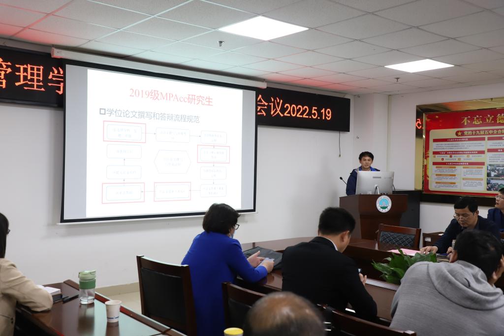 裴潇副院长就我院研究生人才培养、学位管理与招生工作等进行了总结汇报,并通报了今年申请学位论文答辩的资格审核和论文盲审情况,对近期工作进行了部署。MBA教育中心李洪文主任和MPAcc教育中心叶云主任分别对MBA和MPAcc硕士培养的教学、实践、论文等各环节提出了要求。