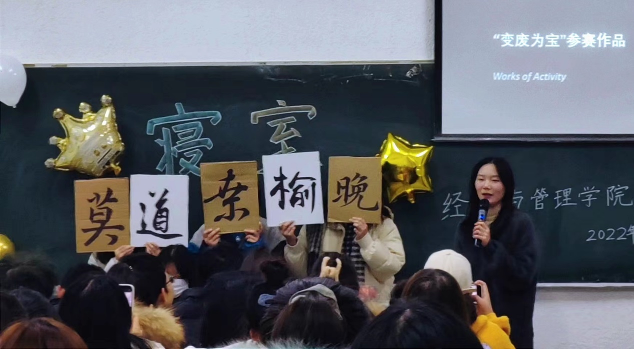 活动开始,主持人王璐佳为大家介绍比赛赛制:十组参赛队伍以寝室为单位上台宣讲,用ppt展示参赛作品并阐释,适当添加才艺表演。各队展示总时间为4分钟,计时人员通过举牌的方式从旁提醒用时,超过规定时间的队伍将被扣分。