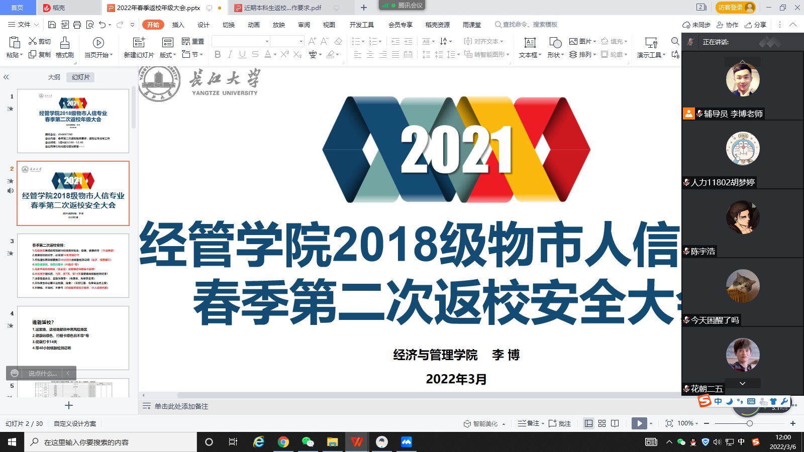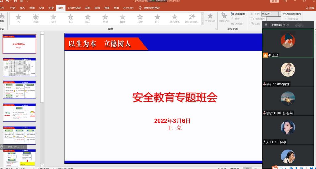 为加强学生日常安全教育管理,进一步做好疫情防控工作,确保开学以后全体学生的平安,经管学院以班级为单位,通过线上会议的方式召开了2022年春季学期的安全教育主题班会,班主任和辅导员参加了会议。
