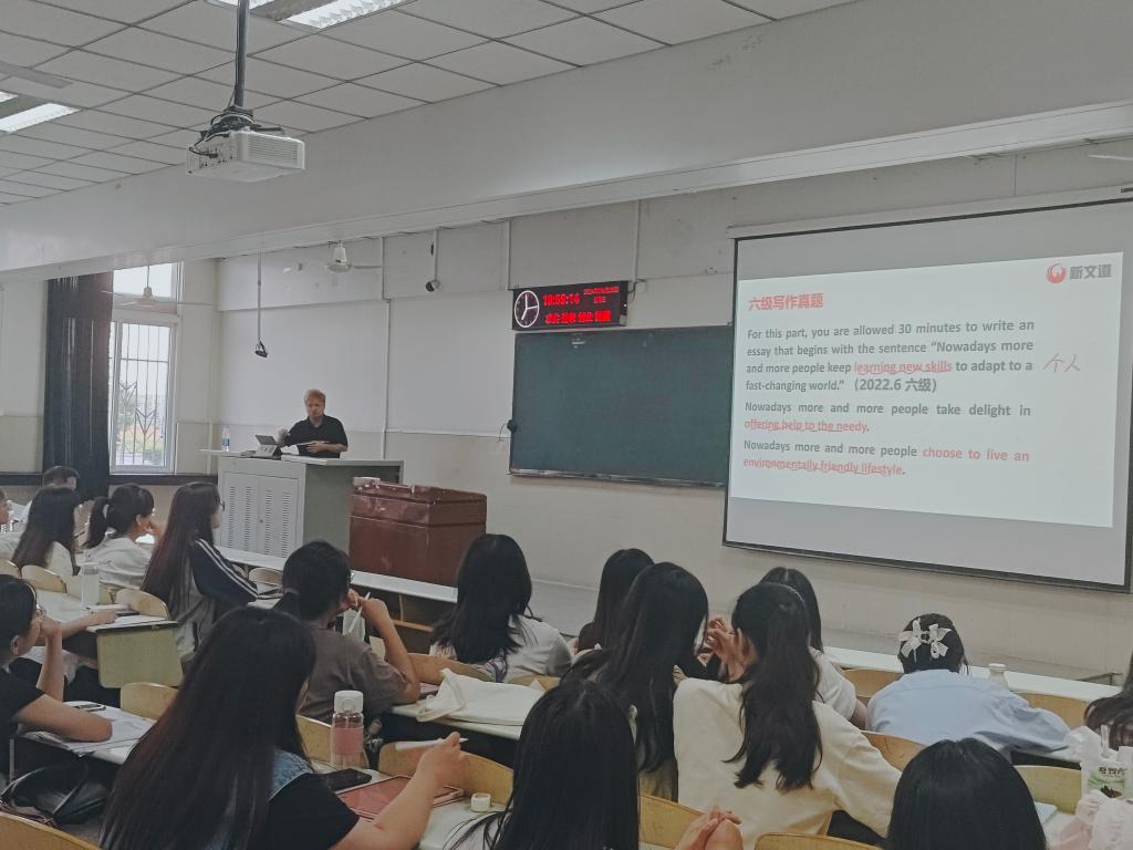 随后,六级备考指导由新文道英语教研老师杨帆负责现场授课,他结合六级真题从整体卷面到具体环节部分分析,不仅指出每种题型特点,还教授做题技巧。与此同时,中间穿插一些经典真题,并对这些进行了逐步细致的分析解答,最后还给予学生一些提分的技巧与资料。这些干货分享使学生收获满满,极大地增强了备考信心。