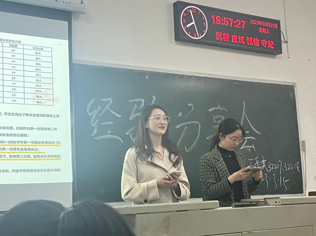 接着,经管学院两位优秀学姐严诗意和冯亚枝分享了自己在大学的生活经验和学习经验,便于同学们在接下来的大学生活中更充实、更清晰的度过提供经验,并为大家的四级备考提供指导。
