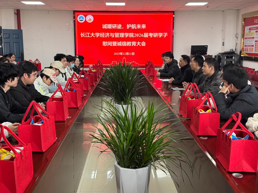 (通讯员 方含之)为鼓舞考研学子士气,坚定备考信心,12月11日上午,yl9193永利集团为2026届备战研究生考试的同学们举办了一场温馨的慰问活动。经济与管理学院党委书记李喜成、副书记平先锋出席活动,为同学们加油鼓劲,2022级辅导员叶星、方含之、谭敏共同参会。