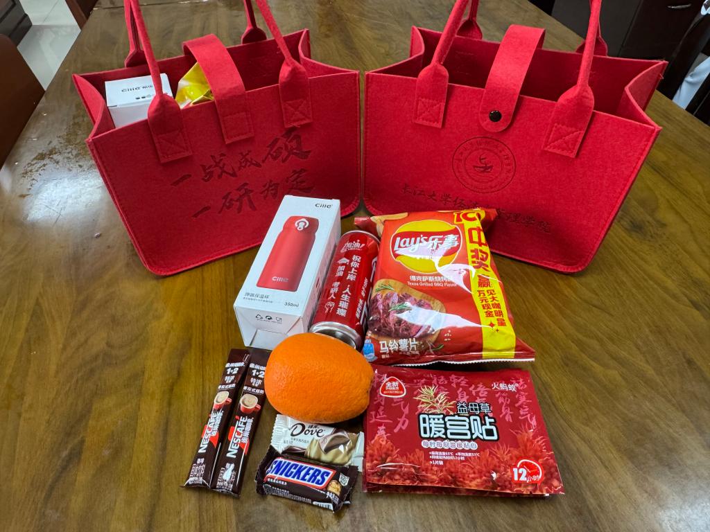 为表达对学子们的深切关怀与美好祝愿,学院精心准备了实用的“考研加油礼包”。礼包内含暖手宝、保温水杯、寓意“心想事成”的橙子、方便提神的咖啡液、补充能量的巧克力及士力架,以及印有“加油考研人”字样的定制可口可乐。每一份礼物都寄托着学院对学子们温暖护航、助力成功的真挚心意。