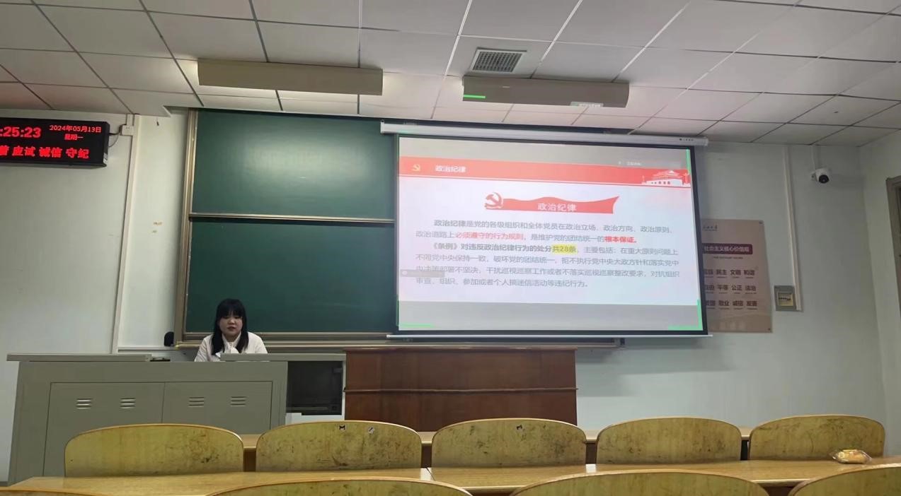 (通讯员 吴孟怡)在党的建设中,党纪教育具有至关重要的地位,是保持党的先进性和纯洁性的重要保障。为推进党纪学习教育走深走实,引导研究生党员学纪、知纪、明纪、守纪,2024年5月13日,yl9193永利集团研究生第一党支部全体党员于13教C-117教室开展五月支部主题党日学习活动,青年委员马艺文同志主持本次学习活动。