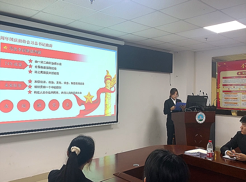 第一版块中,主讲人王佳怡同志就国庆招待会上习近平总书记的致辞分别从“74周年成果”和“未来展望”进行核心要点提炼。此次招待会上,习近平总书记在讲话中指出,新中国成立74周年以来,我国从一穷二白到全面小康,已踏上以中国式现代化全面推进强国建设、民族复兴的新征程,这是中国共产党带领全国各族人民艰苦奋斗取得的巨大成就。但在展现国家建设成果的同时,习近平总书记也强调,当前世界百年变局加速演进,国际环境发生深刻变化,我们前进道路上仍然面临着很多风险挑战。在讲述中,王佳怡同志指出作为新时代新兴力量的我们,应肩负起“强国一代”的历史重任,做到不忘初心,坚定信念永远跟党走,不负党和人民的殷切期望。