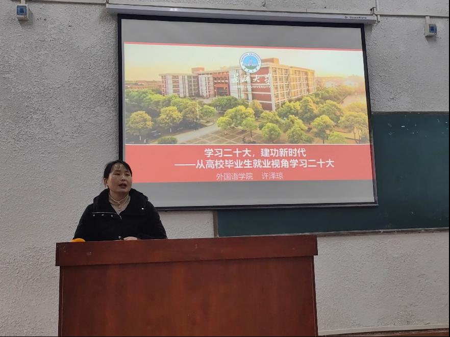 会议伊始,许泽琼老师首先以“大学生应该怎样践行二十大精神”的问题为导向引入正题,随后带领大家从高校毕业生就业视角学习二十大会议报告中的表述,接着从就业选择、行业选择、地域选择、单位选择四个方面展开培训讲解。