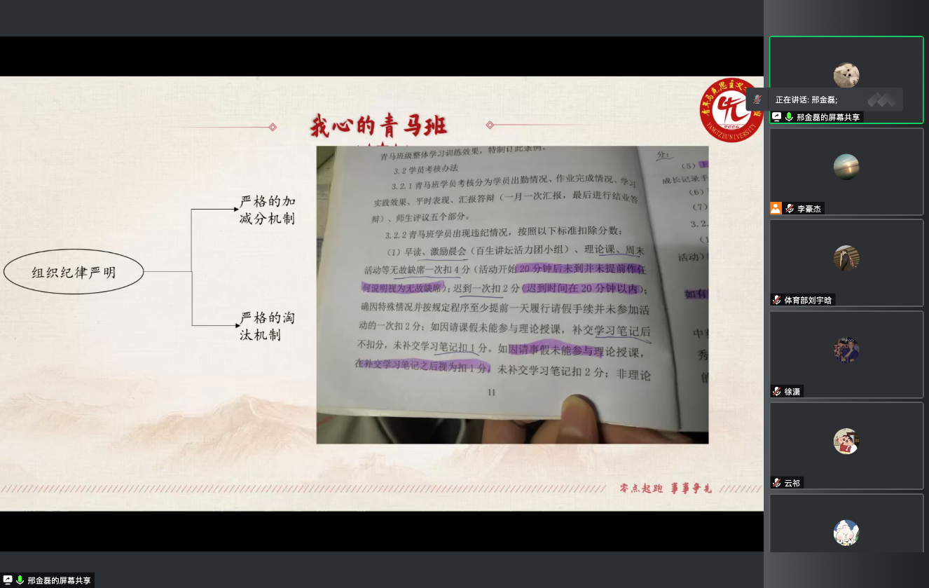 此次有幸邀请到青马班的三位优秀学员代表为我们分享他们在青马班的亲身经历与感受。首先是优秀学员代表张华,她怀着一颗向优秀的人靠近的心,抓住机会加入了青马班。她从三个方面分享了她在青马班的个人成长经历。在学习与科研方面 ,她竿头日上;在工作与学干方面 ,她兢兢业业;在思想与实践方面 ,她始终不忘初心 ,和青马班的同学们一起砥砺前行 。第二位是优秀学员代表邢金磊,他在青马班的每一天都非常充实 。青马班组织纪律严明,他不仅提升了自我约束力,又能够参加各种志愿服务,在社会实践中发光发热。最后是优秀学员代表邓涛,“青马不被定义,每个人都有不同的精彩”“不要害怕,勇敢去冲”是邓涛学长寄予每一位同学的期待。我们当代大学生应当通过对马克思主义的学习,进一步加强政治修养,增强政治信念的坚定性 、政治立场的原则性 、政治鉴别的敏锐性和政治忠诚的可靠性 ,成长为中国特色社会主义事业的合格建设者和可靠的接班人 。