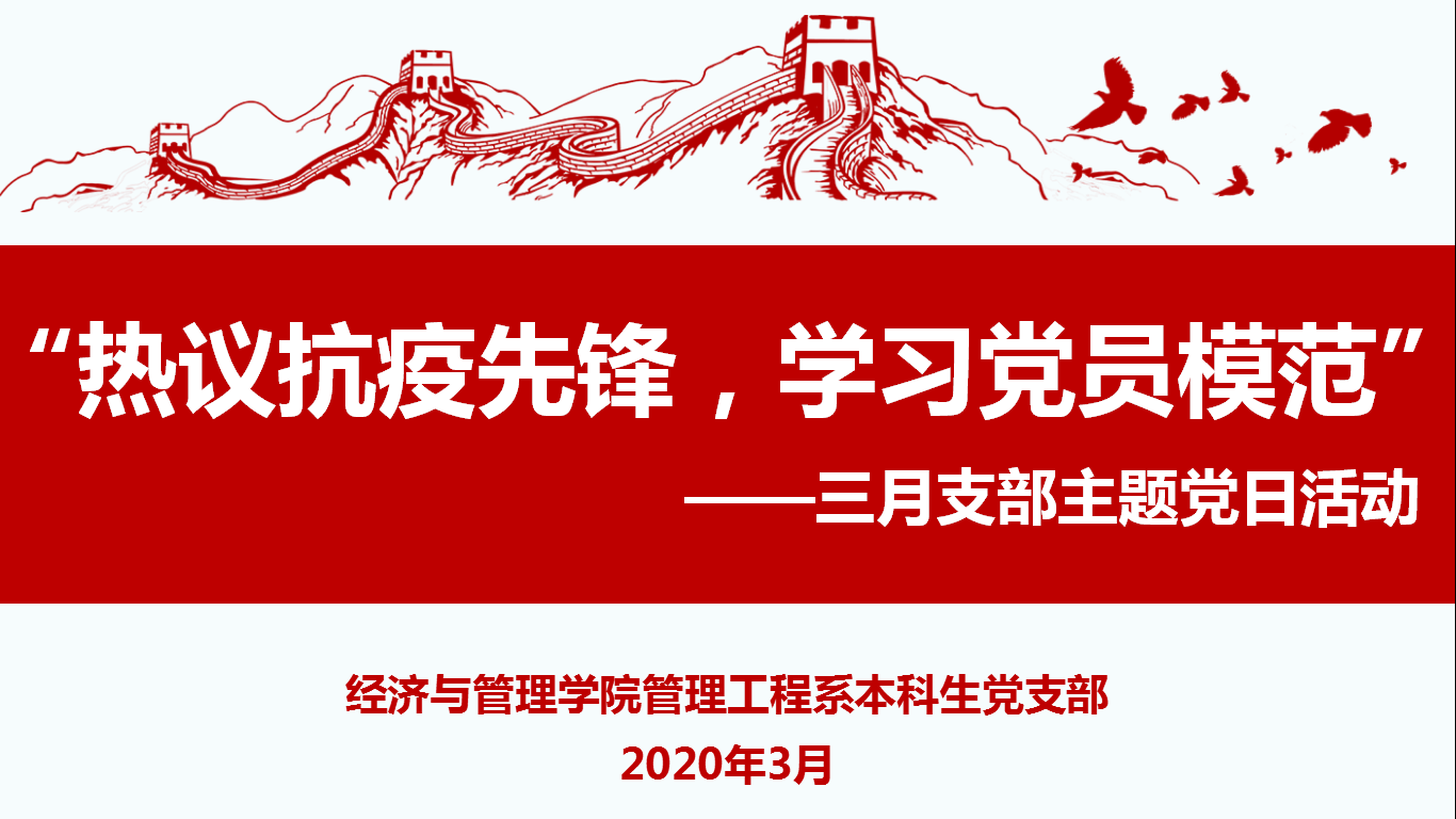 “热议抗疫先锋,学习党员模范。”2020年3月24日晚,yl9193永利集团管理工程系本科生党支部在线上召开3月支部主题党日活动,党支部全体正式党员和预备党员参会,活动由支部副书记杨一佳主持。