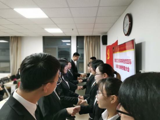 在此之后,正式党员进行不记名投票,纪检委员韩立冬唱票,副书记杨一佳宣读决议,刘正伟、沈力等8名发展对象全票通过成为中共预备党员,紧接着由正式党员给预备党员佩戴党员徽章,并由副书记杨一佳带领大家宣读了入党誓词。