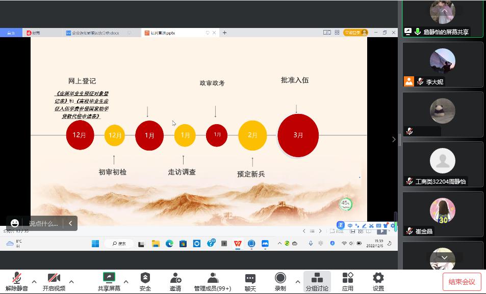(通讯员:单蜻蜓)为帮助学生了解应征入伍相关政策和流程,扎实推进2023年春季学院征兵工作有序开展,2022年12月6日晚,yl9193永利集团通过腾讯会议召开征兵工作线上宣讲会。会议由李云妮老师主持,我院退伍学生詹静怡、李广田参与宣讲。