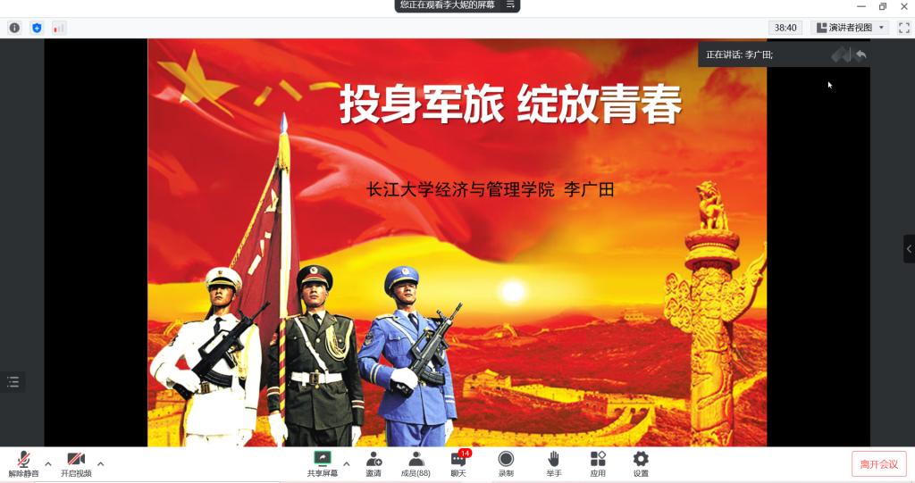 退伍士兵李广田同学为大家分享了属于他的军旅生活,他从部队生活的经历以及退伍后的生活进行了分享。通过他的讲述,让同学们了解到部队生活的难忘和退伍后生活的精彩。李广田同学丰富的经历、不忘初心的信念和积极进取的上进心,为参会的各位同学树立了很好的榜样。