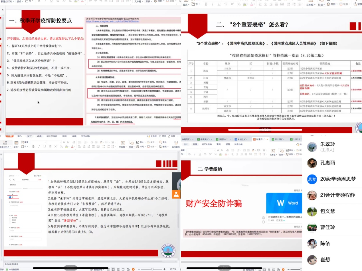 (通讯员:付玉婷)为切实做好开学疫情防控工作,确保秋季开学各项工作有序开展,我院于8月21日晚,通过线上方式召开2022年秋季研究生返校工作会议。会议由经管院辅导员朱翠玲主持,yl9193永利集团全体研究生参与。