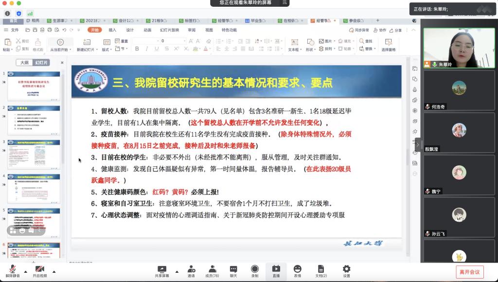 会上,朱老师首先传达了近期荆州市和学校关于疫情防控的重要指示及相关通告精神暑期研究生疫情防控与安全管理工作提出了总体要求:禁止学生返校;非审批不离校;坚持每日健康打卡、尽快接种疫苗。另外,朱老师对学生身心健康、学习状态、求职规划给出了诸多建议,为开学做好准备。