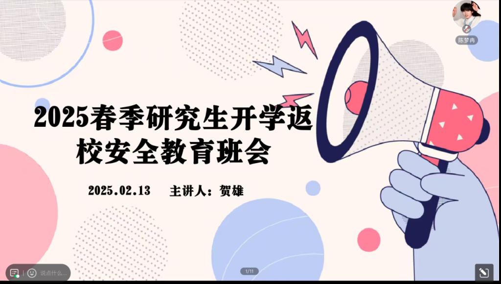 (通讯员 陈梦冉)为切实提升研究生的安全意识,确保新学期校园生活安全有序开展,学院于2025年2月13日下午成功召开了研究生春季开学返校安全教育班会。此次班会由辅导员贺雄老师主持,全体研究生参加会议