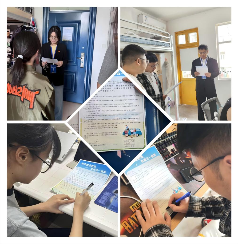 开展宿舍宣讲,排查安全隐患。研究生代表凌澜格、吕硕洋深入学生宿舍宣讲,发放安全告知书并张贴于寝室门后。提醒同学们要时刻绷紧安全这根弦,在享受假期的同时不忘保护自身安全。