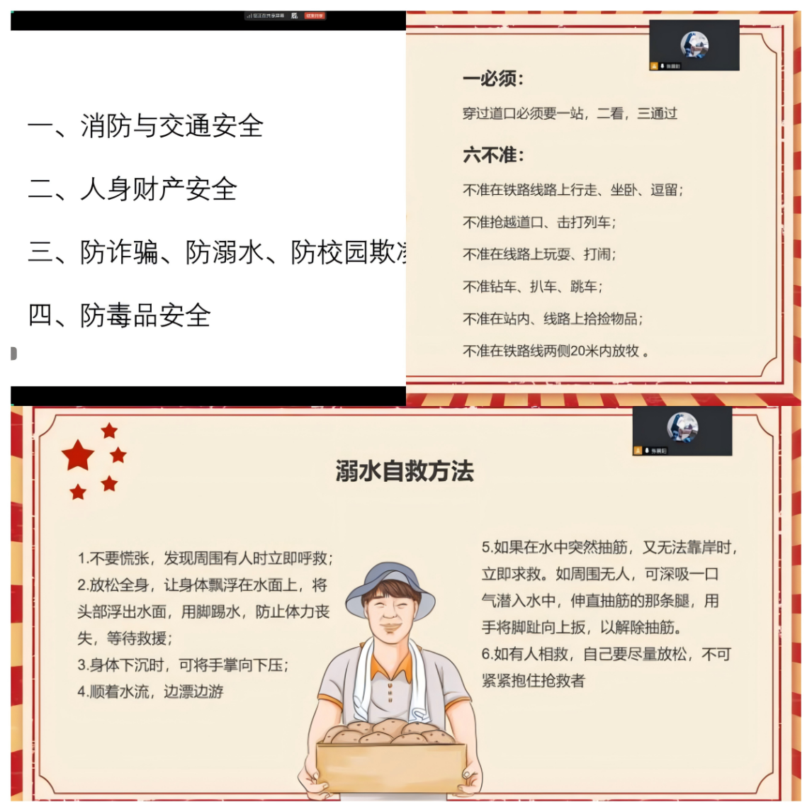 其次,围绕网络安全进行文明专项引导。第一,防诈骗教育,剖析网络刷单、虚假中奖等高发骗局,传授“不轻信、不透露、不转账”原则;第二,强调网络行为规范,要求同学们理性发表言论,不传播虚假信息、拒绝网络暴力与恶意评论,主动维护清朗网络空间,争做文明上网表率。第三,如遇校园欺凌,及时告知辅导员,明确“零容忍”态度。