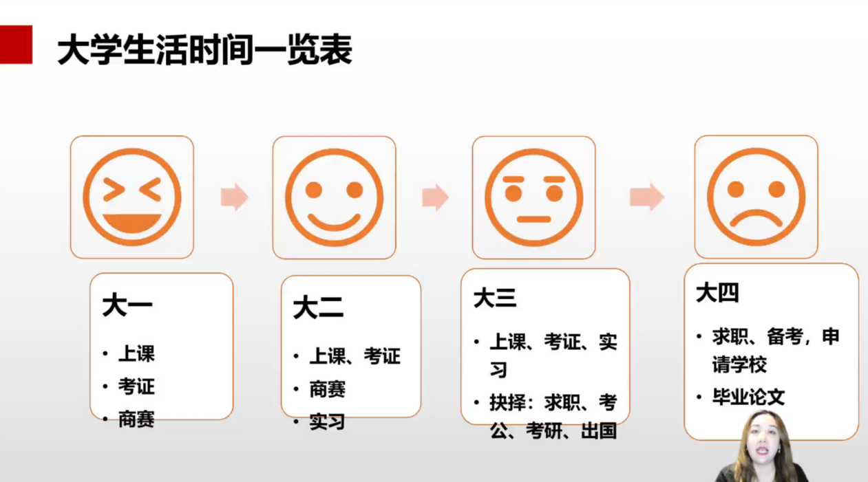 Candice老师从大学生考研及就业形势解读、商科学子的能力提升方向、大学期间时间规划三方面进行讲解,通过引用报考、就业数据和企业能力要求,全方位阐述了现阶段经管学子面对的风险挑战与应对策略。