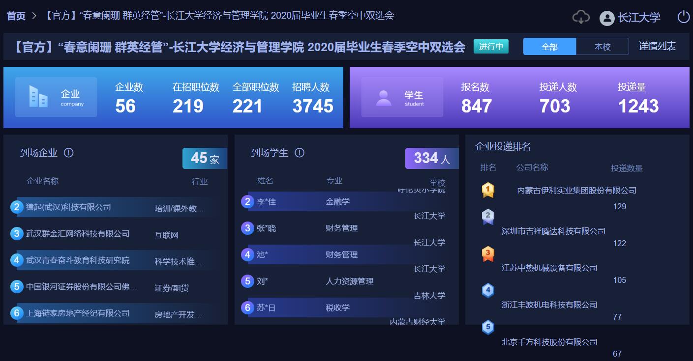 (通讯员 苏帅)“春意阑珊,群英经管。”为了高效服务毕业生开展求职,加强与用人单位开展招聘工作,经济与管理学院于427--28日举办2020届春季空中双选会。本次双选会参会单位56家,共提供职位数219个,设置招聘人数达3745涉及单位以武汉为主,包括来自北京、广东、上海、湖南等多个省/市,提供包含金融业务员、经济业务员、储备经理以及辅导老师等多种岗位。参与本次空中双选会的学生共报名847人,共计投递简历1243