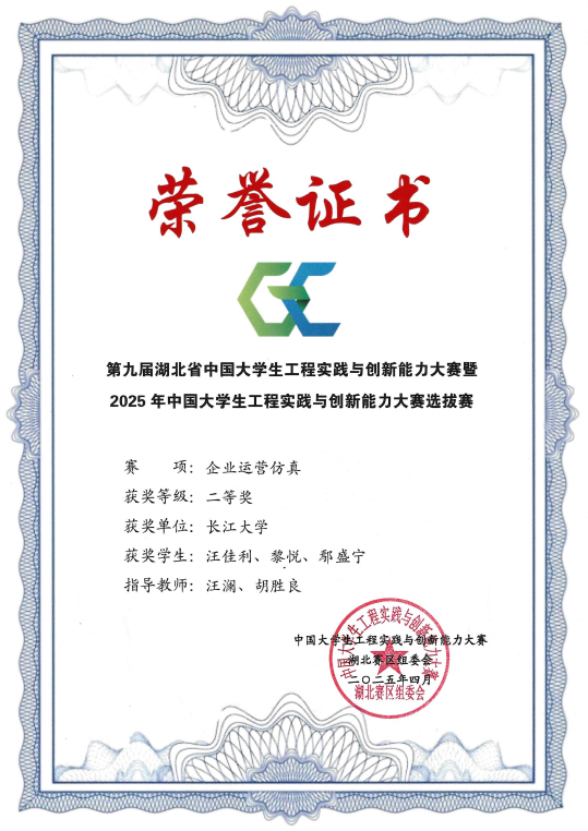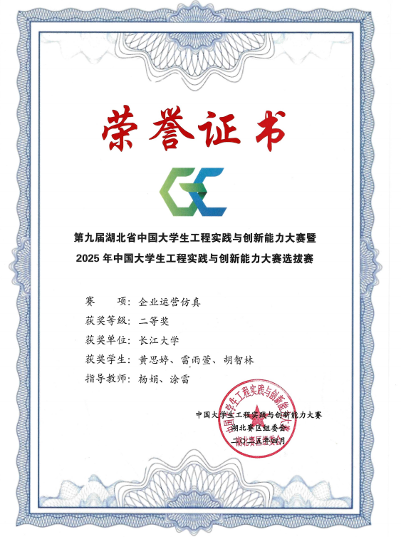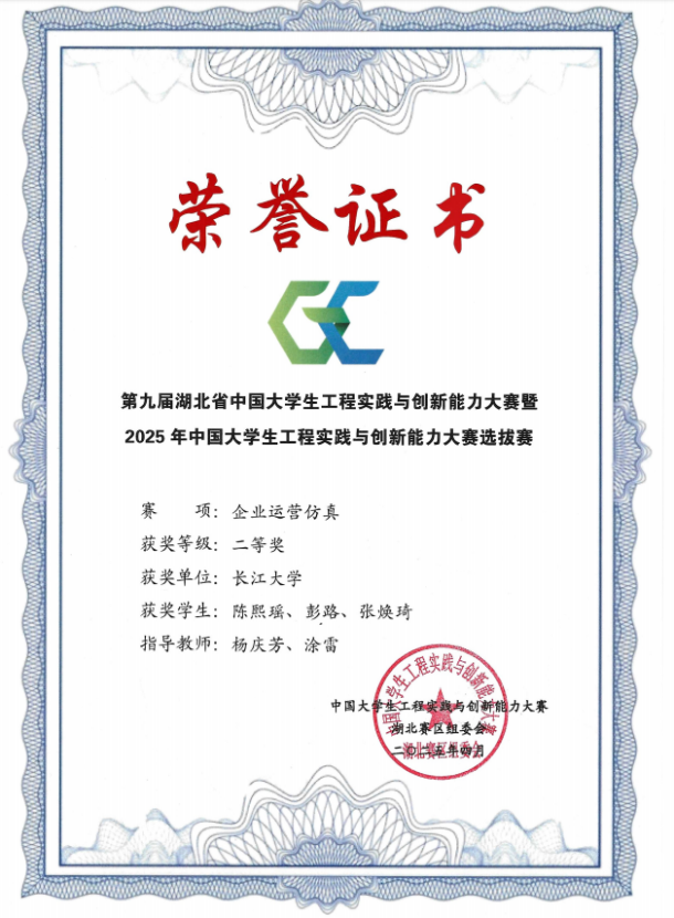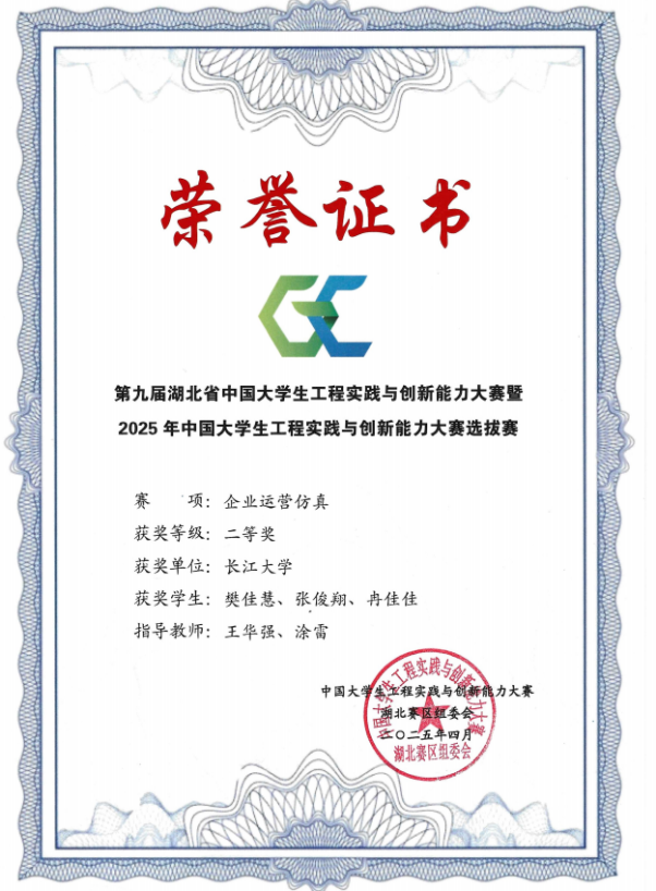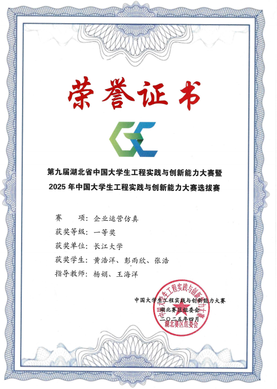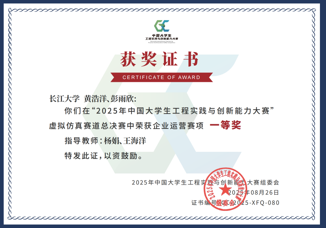 (通讯员 雷宇)近日,2025年中国大学生工程实践与创新能力大赛全国总决赛圆满落幕。由我院杨娟、王海洋老师指导,卓12201班黄浩洋、会卓12301班彭雨欣组成的参赛团队,凭借出色的企业运营仿真能力与创新思维,一路过关斩将,最终荣获全国一等奖,展现了我院学子卓越的企业管理知识与跨学科综合能力,为学校赢得了崇高荣誉。