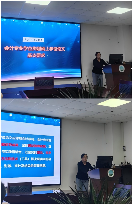 康玉梅教授以《会计专业硕士学位论文选题与写作》为主题,主要从会计专业硕士学位论文基本要求以及选题与写作建议两个方面展开介绍。她以全国会计专业学位研究生教育指导委员会颁布的《会计专业学位类别硕士学位论文基本要求(试行)》方案为出发点,详细介绍了学位论文类型及其相关要求,提出学位论文应落实于会计相关领域、坚持理论指导实践以及强调实践导向性。对于会计专业硕士学位论文的选题以及写作方面,康老师通过列举多个实例,指出论文写作要避免题材旧、话题过热、内容单薄、难有创新点等问题。