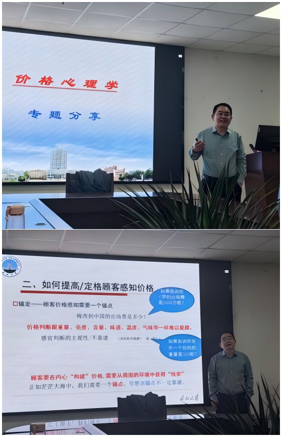 李明武教授以《价格心理学》为主题,从价格与顾客感知、如何提高顾客感知价格以及差别定价三个方面展开介绍。他以生动有趣的生活案例,从价格衬托、价格风险心理以及价格攀比心理等方面为同学们阐述了商品价格与消费心理的关系。对于如何提高顾客感知价格,李老师以不同学派对于商品定价的内涵切入,指出价格是消费者的心理感知,从消费者的视角提出了若干提高顾客感知和成功定价的策略。在差别定价方面,李老师由相关理论以及实际案例,阐述了差别定价的重要依据是顾客感知差异,包括消费者喜好、需求强度等方面。